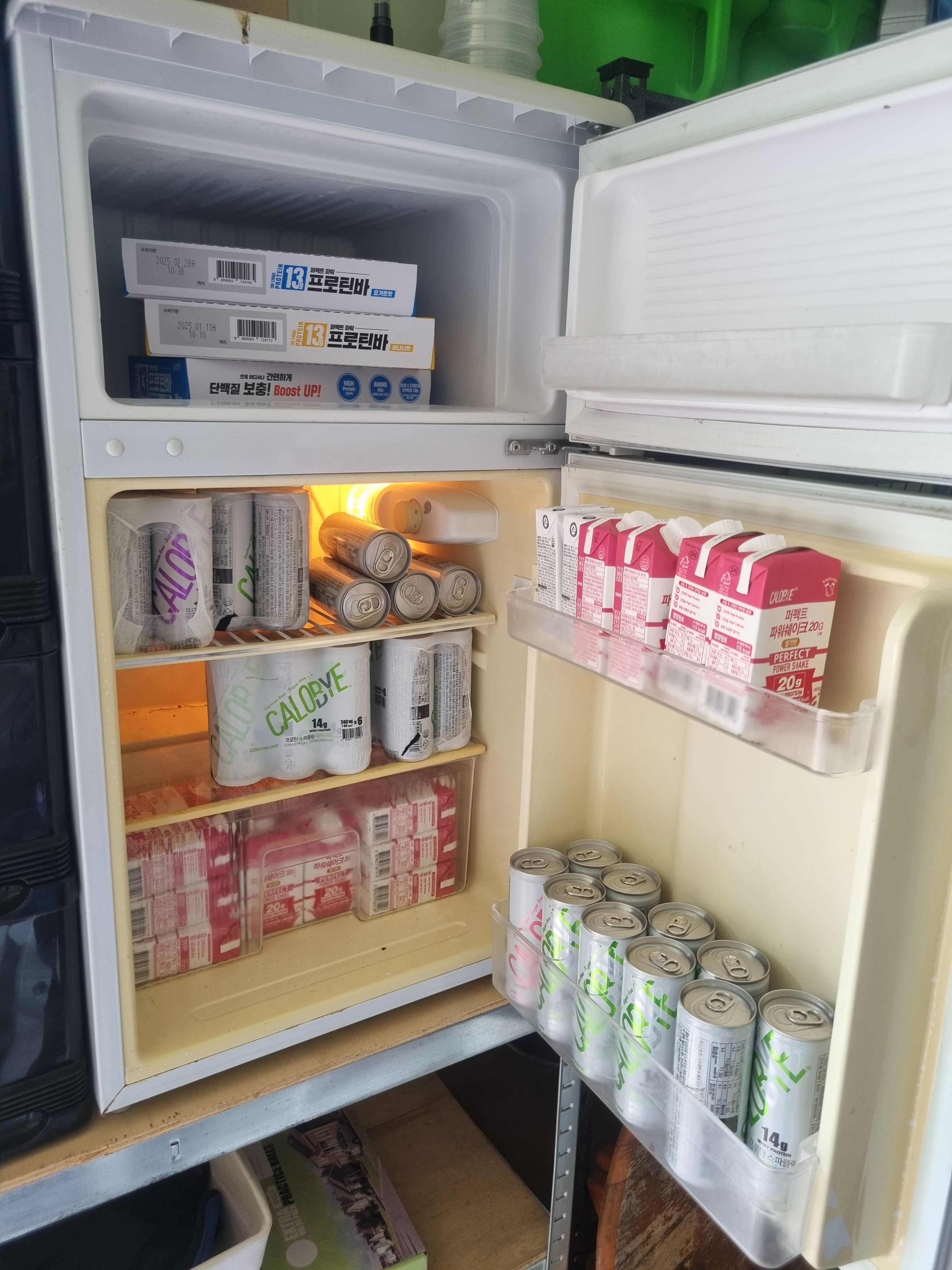 The gym fridge is full of Calobye protein, drinks, shakes and bars